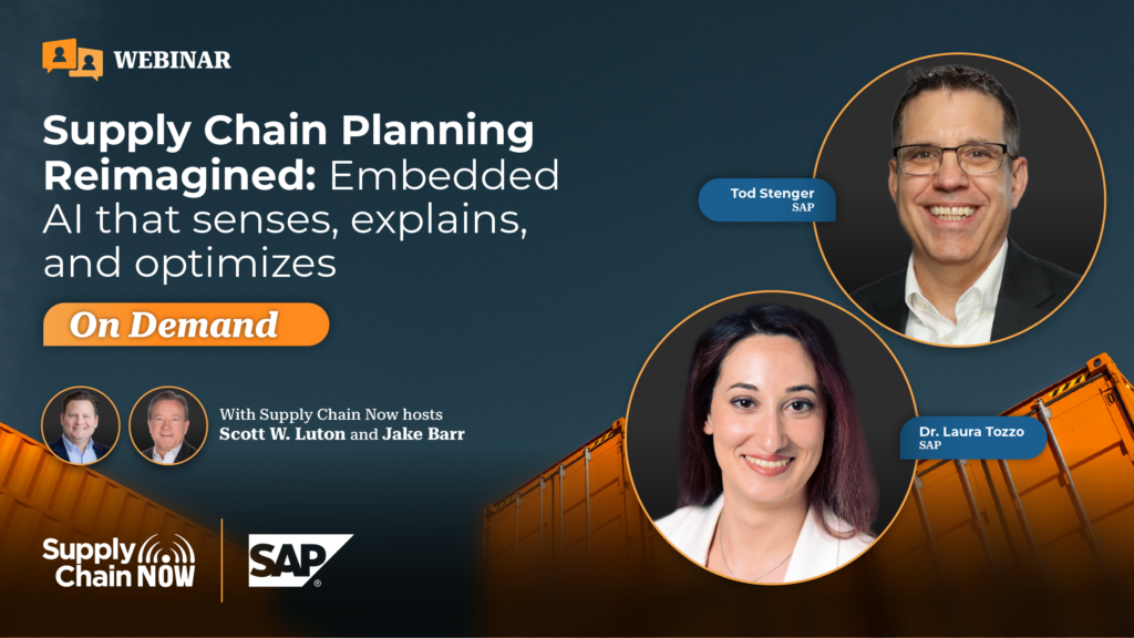 In today’s rapidly evolving supply chain planning landscape, staying ahead demands more than incremental tweaks—it requires reimagining how AI is embedded into every planning decision. Join Supply Chain Now hosts Scott Luton and Jake Barr for a forward-thinking discussion with industry experts Tod Stenger and Dr. Laura Tozzo from SAP. This session will explore the strategies, trends, and approaches for AI that are reshaping supply chain planning. Learn how innovation, data-driven decision-making, and AI tools can enhance resilience, improve planner efficiency, and create more agile, customer-focused supply chains. Walk away with: Fresh strategies to strengthen planning resilience in a volatile environment A closer look at AI and emerging innovations transforming supply chain planning Practical ways to boost efficiency and streamline end-to-end processes Whether you’re navigating disruption, evaluating emerging technologies, or looking to improve planner efficiency, you’ll walk away with actionable insights to help future-proof your operations.