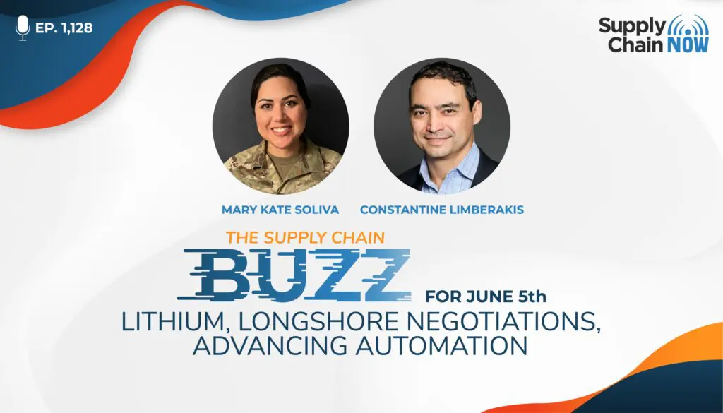 The Supply Chain Buzz is Supply Chain Now’s regular Monday livestream, held at 12n ET each week. This show focuses on some of the leading stories from global supply chain and global business, always with special guests – the most important of which is the live audience! This week’s edition of The Buzz featured Scott Luton, co-host Constantine Limberakis, and special guest Mary Kate Soliva. She joined the second half of the show to talk about the impact of Typhoon Mawar, the strongest typhoon to hit the island in over 20 years. Guam is home to 150,000 residents as well as Andersen Air Force Base. In this livestream, created in collaboration with a live Supply Chain Now audience, Scott and Constantine discussed: • The growing demand for lithium batteries versus the constraint associated with just three countries – Australia, Chile, and China – being responsible for 92 percent of the world’s supply • Operational challenges resulting from contract negotiations between the longshore workers’ union and West Coast port operators • The expansion of automation, and why Jeff Bernstein, President of the Association for Advancing Automation, thinks agriculture, food processing, and healthcare will be next