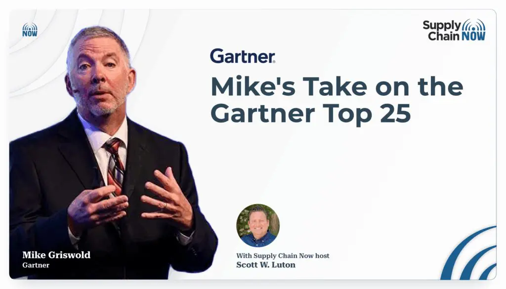 Gartner’s Top 25 Supply Chain ranking was started 19 years ago to celebrate the best supply chains in the world and to raise awareness about the impact a well-run supply chain can have on the overall health and competitiveness of a business. Mike Griswold is the Vice President of Research at Gartner, specializing in retail with a particular focus on forecasting and replenishment. He is responsible for Gartner’s annual Top 25 Supply Chain ranking and joins Supply Chain Now on a monthly basis to discuss the latest in retail supply chains from an analyst’s perspective. In this episode, Mike talks about his 3 key takeaways (plus 2 more) from this year’s top 25 supply chains with co-hosts Scott Luton and Greg White: • The maturity and sophistication required to build and operate a world class supply chain through third party relationships • The power of understanding that a ranking like the top 25 is not a goal in and of itself, but rather an outcome • 2 Notable macro trends: identifying and seizing new opportunities and keeping the employee experience front and center