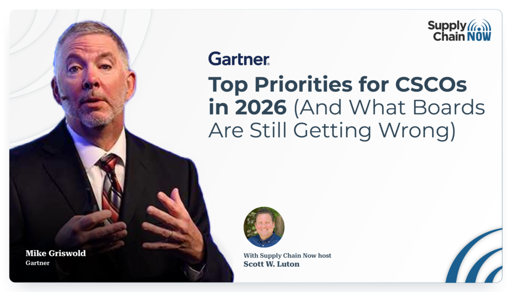 [00:01:12] Scott W. Luton: That is awesome. Well, we’re going to have to set up a whole different show and walk down memory lane in a more deliberate fashion. But folks, today we continue one of our longest running and most popular series, supply chain today and tomorrow with Mike Griswold with Gartner. Of course, many of y’all will know that he serves as Vice President Analyst with Gartner. And today we’re going to be touching on a variety of topics, including an updated take on winning in the turns. What Mike thinks many boards are still getting wrong about supply chain. Top priorities for CSCOs here in 2026 and one of Mike’s favorite recent use cases for AI, all that and much, much more. So stay tuned as we walk through a great discussion with lots of actionable takeaways with the one and only Mike Griswold. Mike, are you ready to go for a great conversation?