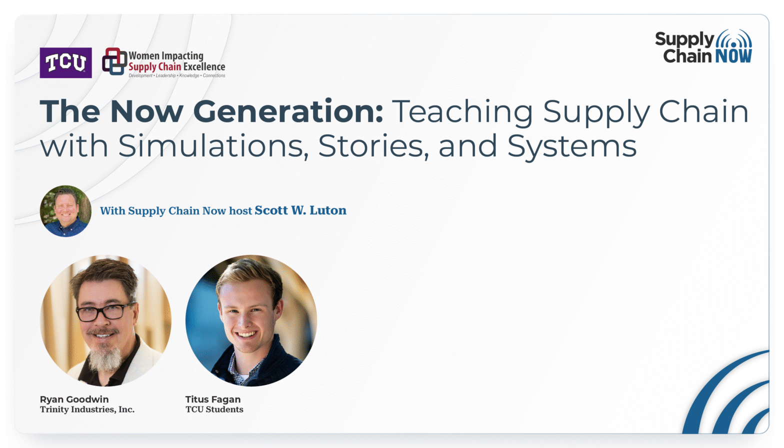 As supply chain technology accelerates, the ability to translate operational knowledge into scalable systems is becoming a defining advantage for both companies and early-career talent. In this episode of Supply Chain Now’s Now Generation series, Scott W. Luton sits down with Ryan Goodwin, Sr. Director of Supply Chain Technology & Innovation at Trinity Industries and an adjunct professor at Texas Christian University, alongside Titus Fagan, TCU Student Body Vice President and a third-year accounting major with a minor in energy business.