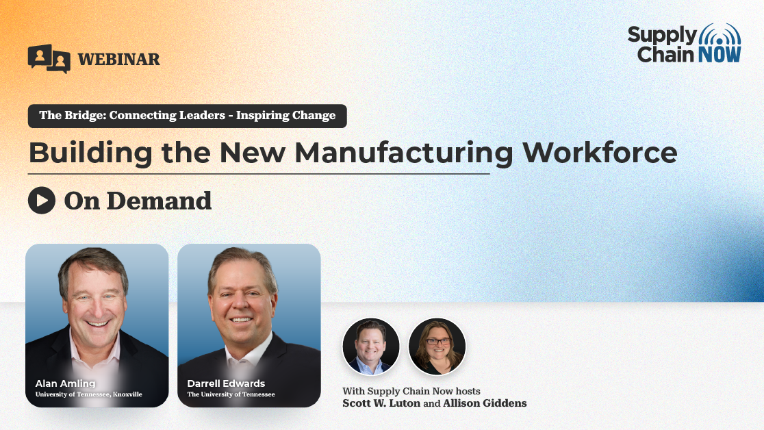 As strategic forces push manufacturing back to America, one obstacle threatens progress: finding the right people with the right skills. Before new factories can produce anything, they must be built—requiring a new generation of skilled tradespeople such as electricians, welders, and technicians. And once these modern facilities are operational, companies report an unexpected challenge: the biggest talent gaps aren’t just technical, but also in core soft skills like leadership, critical thinking, and communication. Join Supply Chain Now hosts Scott Luton and Allison Giddens as they welcome Alan Amling and Darrell Edwards from the University of Tennessee–Knoxville to explore a practical approach to developing a comprehensive workforce from the ground up. Learn what it truly takes to build, staff, and sustain the next generation of American manufacturing.